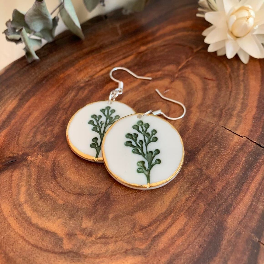 These one-of-a-kind ceramic earrings are handmade by a skilled artist and feature charming hand-drawn designs Perfect for making a statement, they will add a touch of uniqueness to any outfit, day or night.